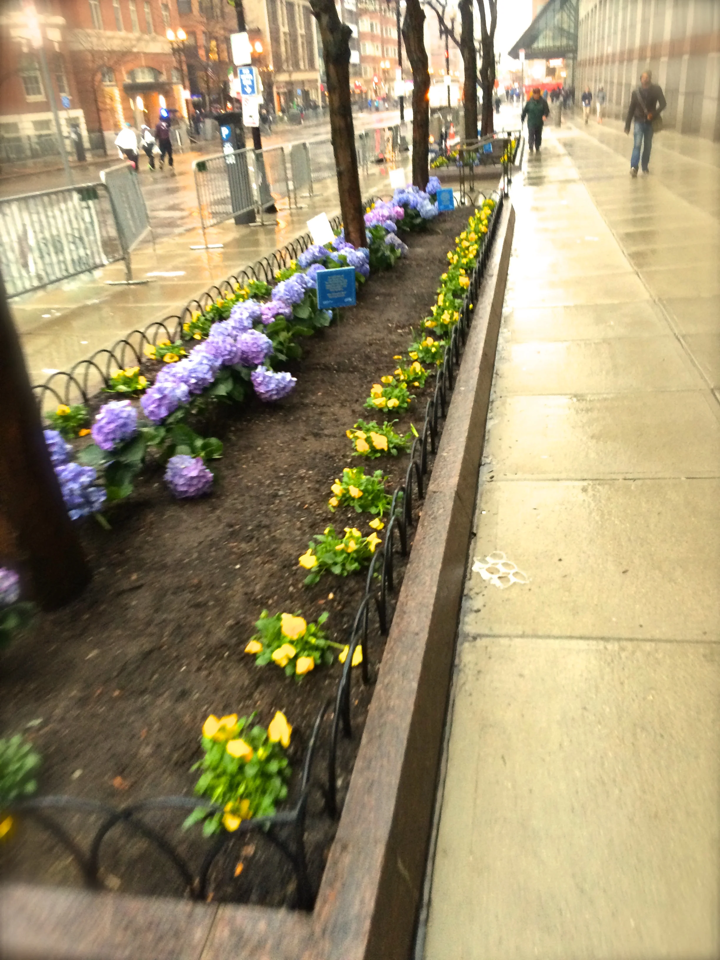 {Boston Strong colored flowers in the pouring rain at the finish line}